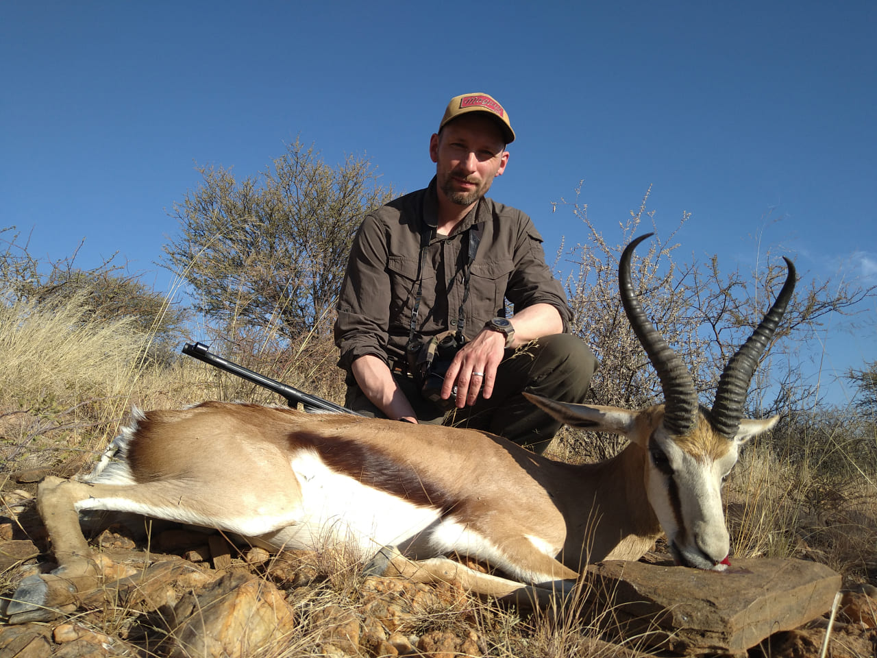 Great Guide! 1 1/2 hours stalk through the mountains, Zebra missed, Oryx seen and then the Kudu as a final reward. Next day Isaac was guiding successfully again. We saw Hartebeest, Blue Wildebeest, Black Wildebesst, Duiker, Kudu, Blesbck.. We decided to go for Springbock and were successful from about 20m. What a pleasure...Moritz Hagenmüller
